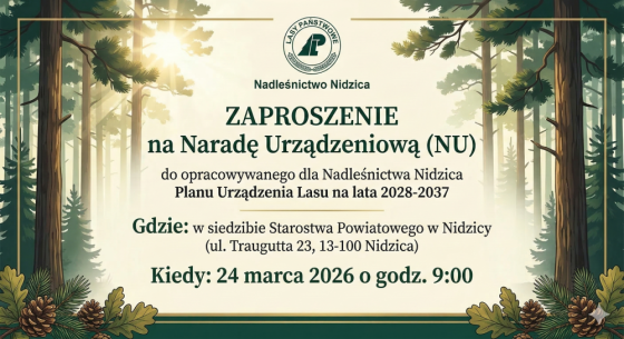 Działając na podstawie zapisów Zarządzenia nr 116 Dyrektora Generalnego Lasów Państwowych z dnia 14 grudnia 2023 w sprawie Instrukcji Urządzania Lasu, Regionalna Dyrekcja Lasów Państwowych w Olsztynie informuje, o rozpoczęciu debaty publicznej dotyczącej projektu planu urządzenia lasu dla Nadleśnictwa Nidzica, której pierwszym elementem jest przedstawienie oraz uzupełnienie założeń do projektu planu urządzenia lasu.